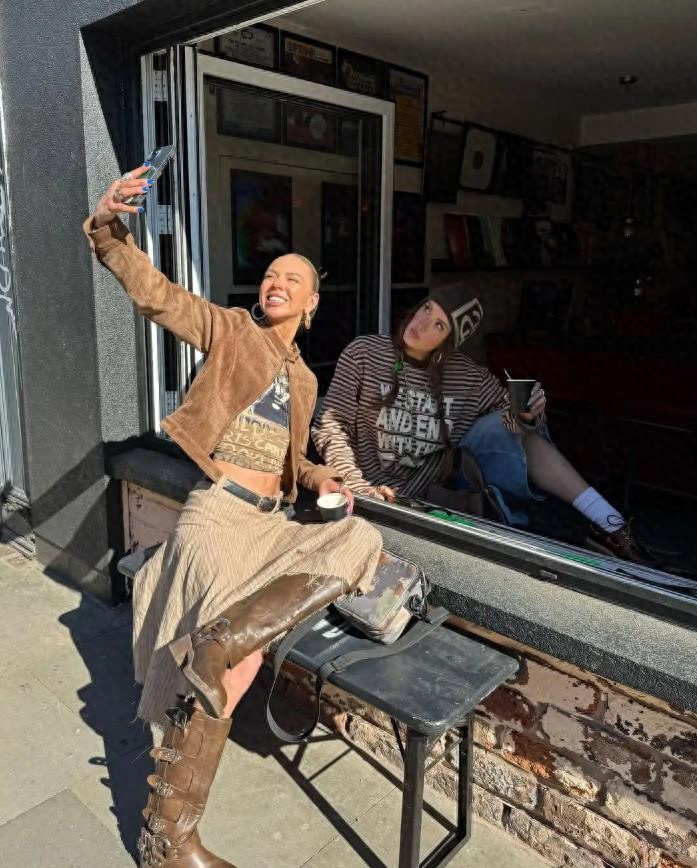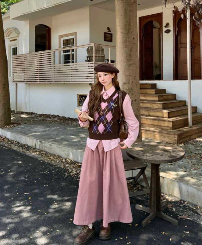 棕色大抵是很适合秋冬的一个色调了吧,但是像棕色、咖色这些深色系列,不适宜大面积使用,建议可以从包包、鞋子或者是一些腰带来选择,棕色+粉色撞色的毛衣马甲,叠穿粉色衬衫,下身的半身长裙也是粉色的,与衬衫进行了呼应,不管是拍照,还是逛街约会,这样的打扮都很上镜。