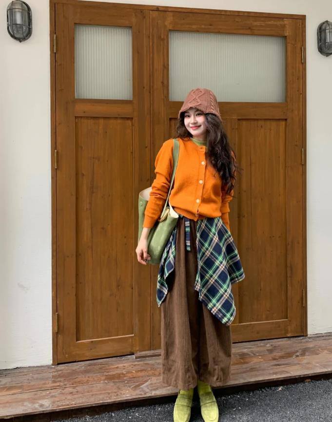 橘子味的秋天来啦,不要让这个秋意渐浓的季节变得沉闷起来,所以你的穿搭就是需要加入一些亮色点缀,橘色的针织开衫,里面叠穿一件芥末绿的打底,可太好看了,下身的搭配才是整个穿搭的亮点,棕色的宽松阔腿裤,自带浓浓的复古调,再利用一件格子衫围在腰间进行修饰,怎么看都是很有范的。