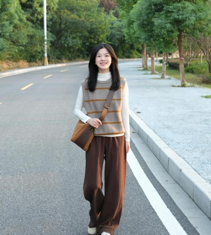 永远都喜欢干净简单的穿搭,这个秋天,你一定要利用起叠穿,比起单一的着装,1+1的叠穿组合,更时髦好看。白色打底+条纹毛衣马甲,再选择一条棕色宽松阔腿裤,出门鞋子配一双白色运动鞋就行,这样的打扮,也太舒适自在了,关键是很显瘦。