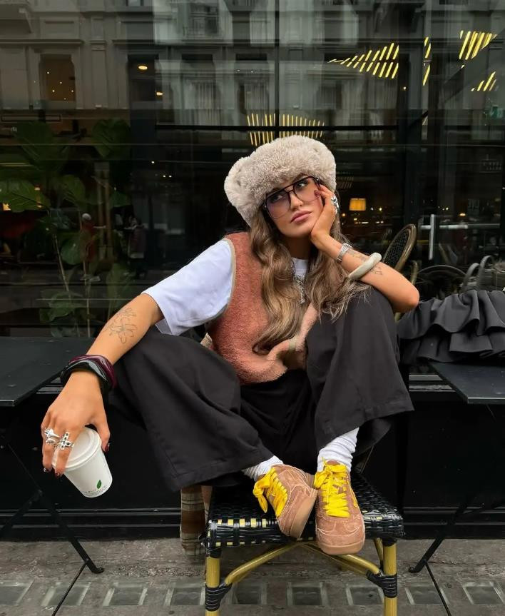 这个秋天,把糖炒栗子色穿上身吧,像这种带着氛围感的色调,不需要大面积运用,你只需一件马甲就好,里面叠穿浅灰的打底衫,真的配一脸,藏蓝色的宽松阔腿裤,没有黑色显得那么沉闷,却足够让你穿出瘦身的效果,棕色的鞋子和包包,都巧妙提升了穿搭的时髦度。