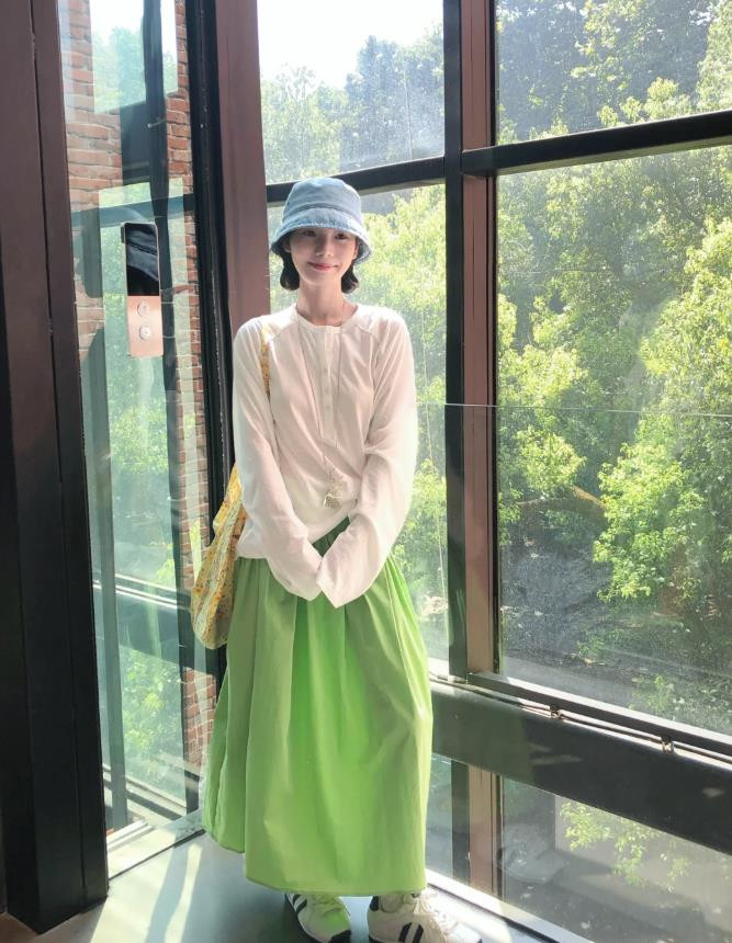 谁说绿色就一定是属于春天的呢?即便是秋天也是可以穿的,现在早秋季节,这么一套穿出街正合适,绿色的半身长裙,真的好美啊,宽松的版型,感觉穿得很舒适自在,也能遮掩身材的缺点,选择一件白色的长袖t恤来配,有种淡人穿搭的既视感。