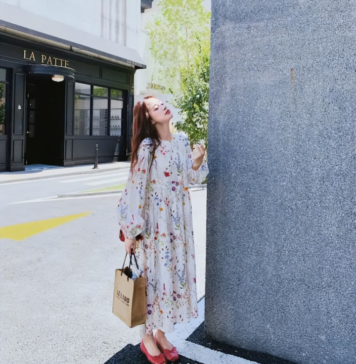 这个带些凉意的秋天,出门直接选择这种长袖的连衣裙最合适了,带点小碎花的设计,浪漫极了,整体的设计简约又大方,宽松的版型,可以有效遮掩住身上的小肚腩,彩色的小碎花更是为你增添了活力,搭配一双红色平底鞋,日常穿着逛街上班都是非常不错的。