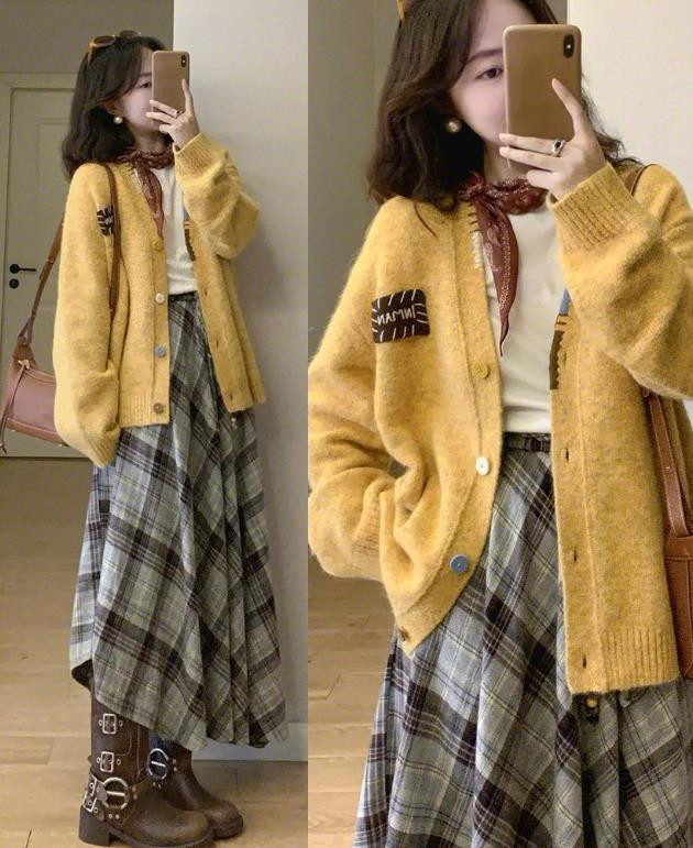 真的太喜欢明媚的色调了,特别是秋冬季节,穿搭总不能选得太沉闷的色调了,南瓜黄色的毛衣,有种被秋日暖阳包围住的感觉,搭配彩色纽扣,这样款式的毛衣开衫,一点也不会单调。下身搭配的波嬉风格纹裙才是整个穿搭的亮点,混搭一双酷酷的短靴,又帅又温柔的。
